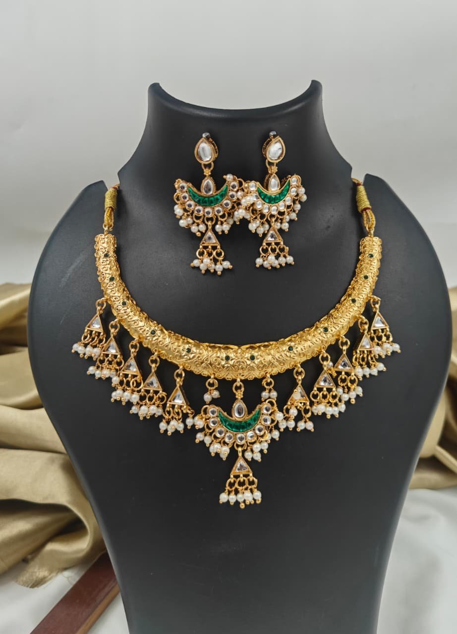 • Traditional Gold Plated Necklace Set for Women will complement any Indian attire. Women Love Jewelry as it not only enhances their beauty, but also gives them the social confidence. Make your moment memorable with this range. This jewel set features a unique one of a kind traditional embellish with antic finish. Earrings are very easy to use being lightweight and has a design which makes it very comfortable.